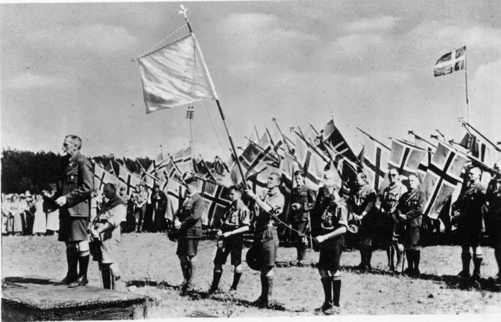 Likheter: Bruk av sermonier og symboler er noe av det som kjennetegner både speidingen og frimureriet. Her speidersjef Hans Møller Gasmann under åpningen av landsleiren på Jeløya i 1936