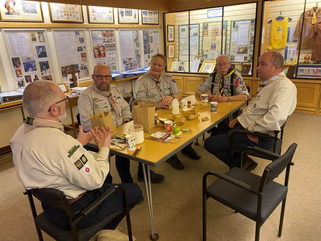 | Billedtekst:Br. Colin Knightley (til høyre) orienterer entusiastisk om speidermuseets utstilling. Til venstre br. Chris Clark. |